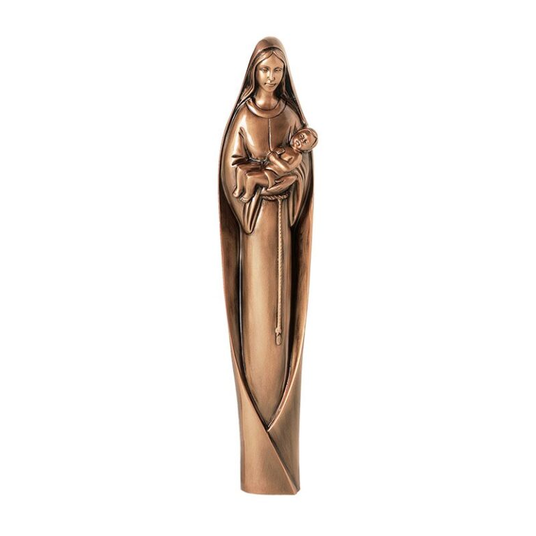 ЗаказатьСкульптура Мадонны выполнена методом литья на итальянском предприятии Cagiatti. Чаще всего бронзовые скульптуры используются для дополнения элитных эксклюзивных комплексов. Изделие крепится на горизонтальную часть памятника с помощью штырей и клея.